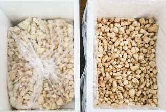 シイタケの水分量を少なくする栽培を行うことにより、調理してもシイタケが縮み難く、シイタケ本来のコリコリとした食感が残るようにしています。